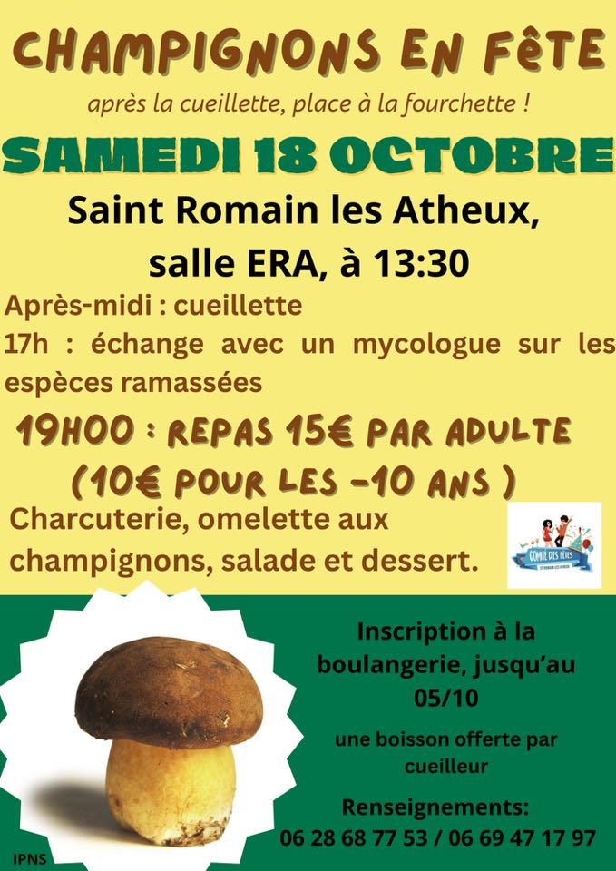 Le comité des fêtes organise une animation autour des champignons, samedi 18 octobre. Au programme : – cueillette dans les bois à 13h30, départ salle ERA. – Atelier d’identification avec un mycologue à 17H00 salle ERA. – Repas à 15€ salle ERA à partir de 19H00, sur inscription à la boulangerie (il reste encore quelques …